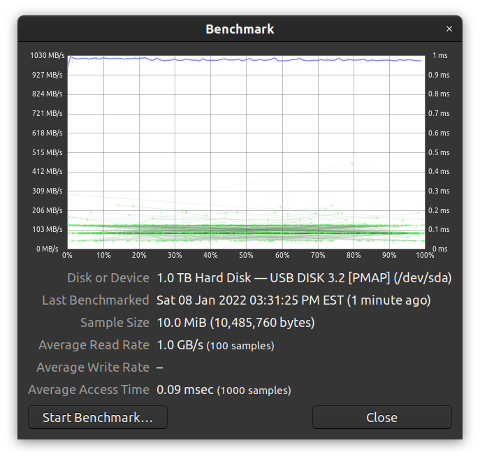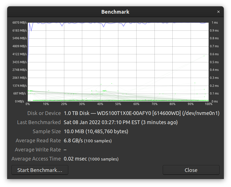 To quantify performance, I ran some quick benchmarks on the SSD and the 1TB expansion card, using the Gnome Disks utility (open Disks, select the drive you want to test, then select ‘Benchmark Disk’ from the Drive Options pull down menu, which is accessed by clicking on the button with three vertical dots on it). For comparison’s sake, I also ran the same tests on an Ubuntu 21.04 guest OS running on top of VMWare Fusion 12.2 Professional on a 2019 MacBook Pro 16,1 laptop running MacOS 12.1 as the host OS. The Framework easily bested the virtual setup; details below: