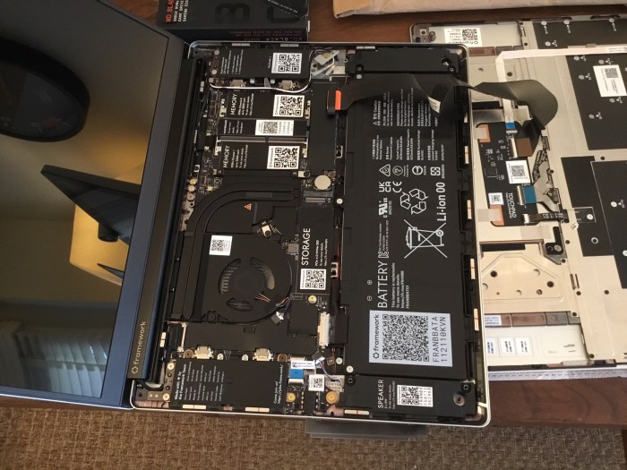 Installing the RAM, SSD, and WiFi card was quick and easy. If you have ever done this for another laptop, you will relish the experience on the Framework, where components are labeled and accessible and are not fettered by crisscrossed gossamer ribbon cables and wires attached by ridiculously delicate connectors. The pic below shows my Framework’s interior, after the components went in. Make sure to read the instructions before you remove the keyboard; it’s simple, but it might not be obvious that you only have to loosen the screws on the bottom, then the keyboard pops off.