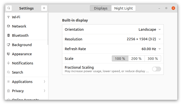Post-install, Gnome was running with the display scaled to 200%, which made all of the icons and windows look big and awkward, and the screen look quite cramped. Perhaps the Framework’s 2256 x 1504 display was big enough to trigger a scaling larger than 100%? The fix was easy: change the scaling to 100% in Settings, in the Displays tab, as below.
