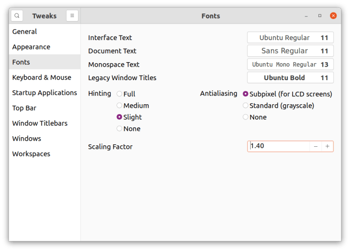 One that was done, I had to change the system font sizes to make them large enough to be legible. That required running sudo apt install gnome-tweaks, and then changing the font scaling factor in the Fonts tab of the Tweaks tool, as shown below. Ubuntu 21 uses Gnome version 40; this tool is the updated version of gnome-tweak-tool. Changing the scaling factor relieves you of the need to fiddle with individual font sizes.