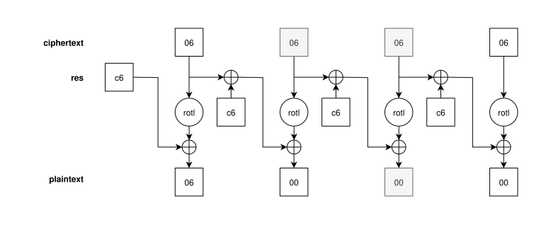 Here rotl<5>(c) returns the result of rotating c five bits to the left. This process is illustrated in the diagram at the top of the page, which shows ciphertext bytes (top row) being converted into plaintext bytes (bottom row). As is conventional, ⊕ denotes the exclusive-or operator.